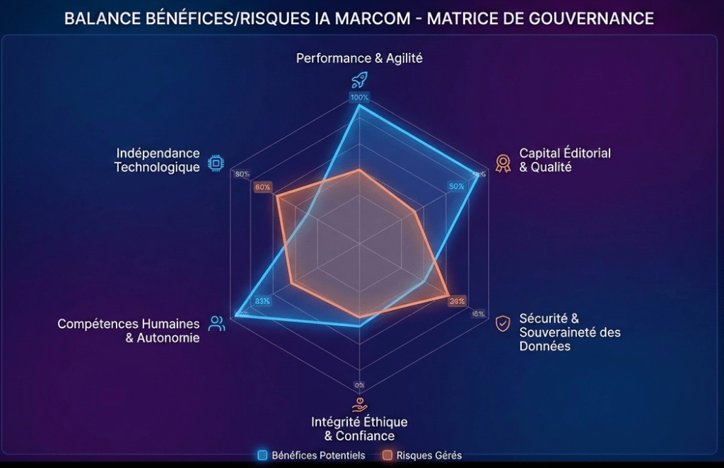 | Diagnostic & Audiences | Analyse 100% des signaux en temps réel. Segmentation fine. | Biais d’analyse et « bulles de filtres ». Qualité des données sources. | Perte de sensibilité : risque de ne plus « sentir » son audience. |